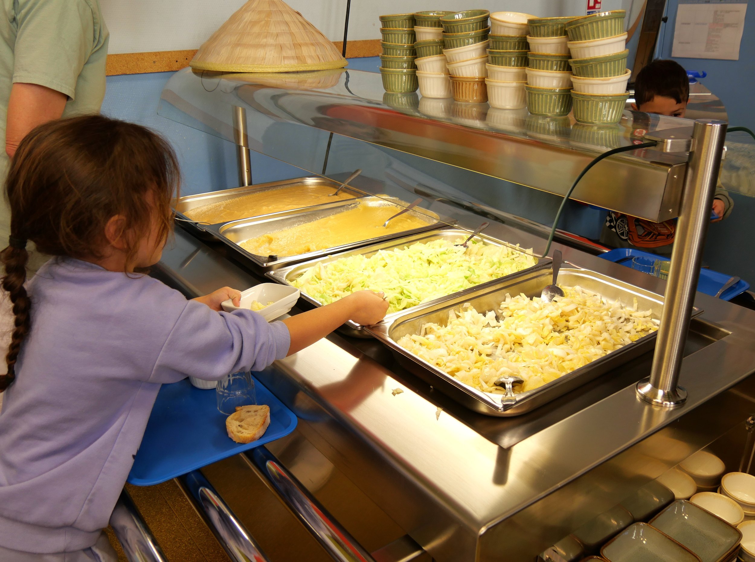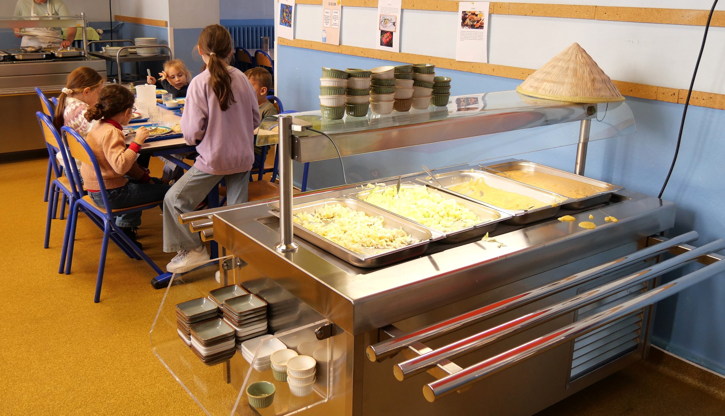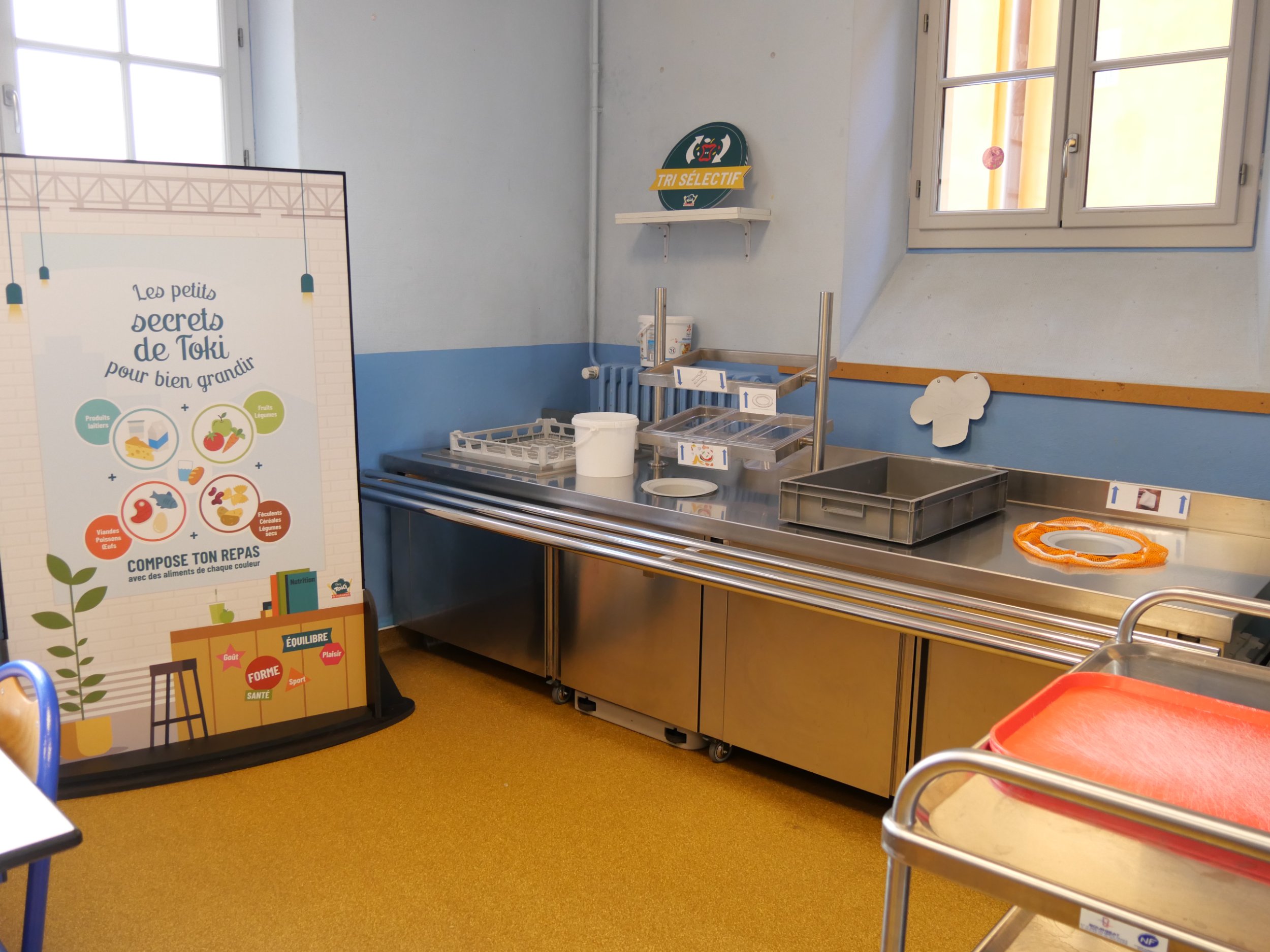 L’installation comprend un présentoir distributeur de plateaux, verres, couverts et panières à pain, une installation d’un îlot froid (les convives se servent eux-mêmes) et d’un îlot chaud (l’enfant peut disposer de son assiette quand il le souhaite). En parallèle, le mobilier choisi est mobile et fonctionnel pour l’entretien tout en garantissant une hygiène optimale.